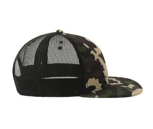 6 panels. Flat visor. Reinforced front panel. Mesh back panel. Seams on visor. Snapback closure.
