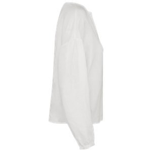 Gathered cuffs, slit with fastened doghouse placket and recycled plastic button.